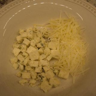 When cream has thickened remove from heat and add the Gorgonzola, Parmesan, salt, pepper and garlic powder. Whisk rapidly until cheese has completely melted.